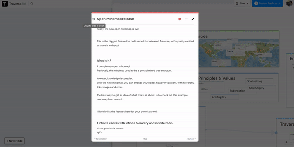 Each mindmap node has notes and flashcards just like before. You can now view them on the screen wherever you want - left side, right side, or center for focus.